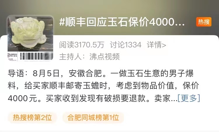 8月5日,安徽合肥。做玉石生意的商家给买家使用顺丰邮寄了一个玉蟾,考虑到物品的价值,商家选择了保价服务。