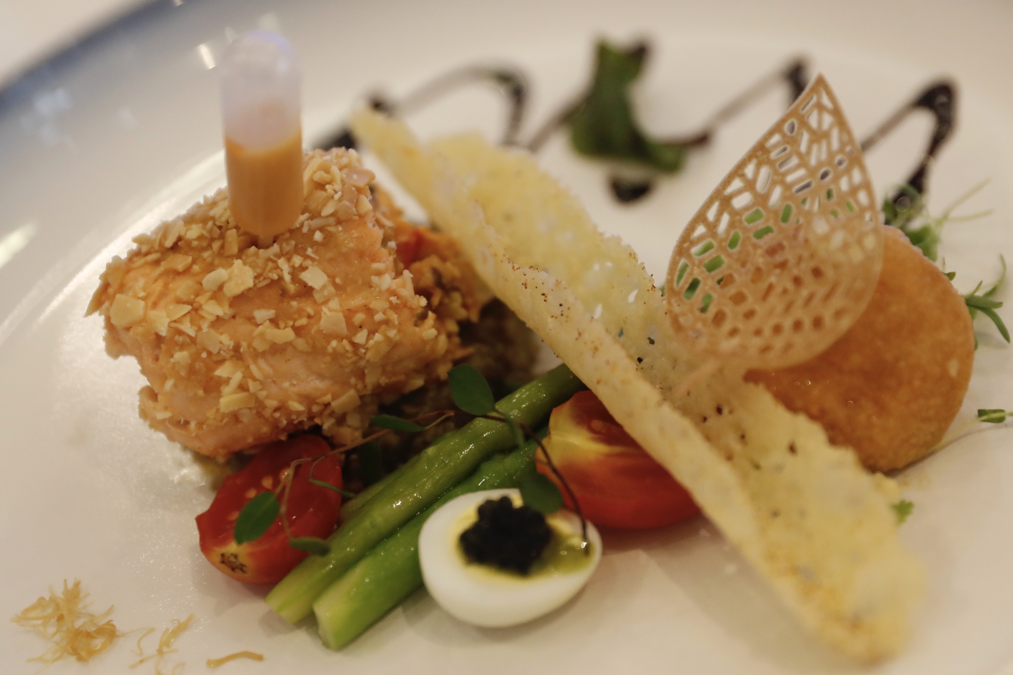 杨枝甘露酥脆球配藜麦罗勒三文鱼杏仁卷——上海大酒店