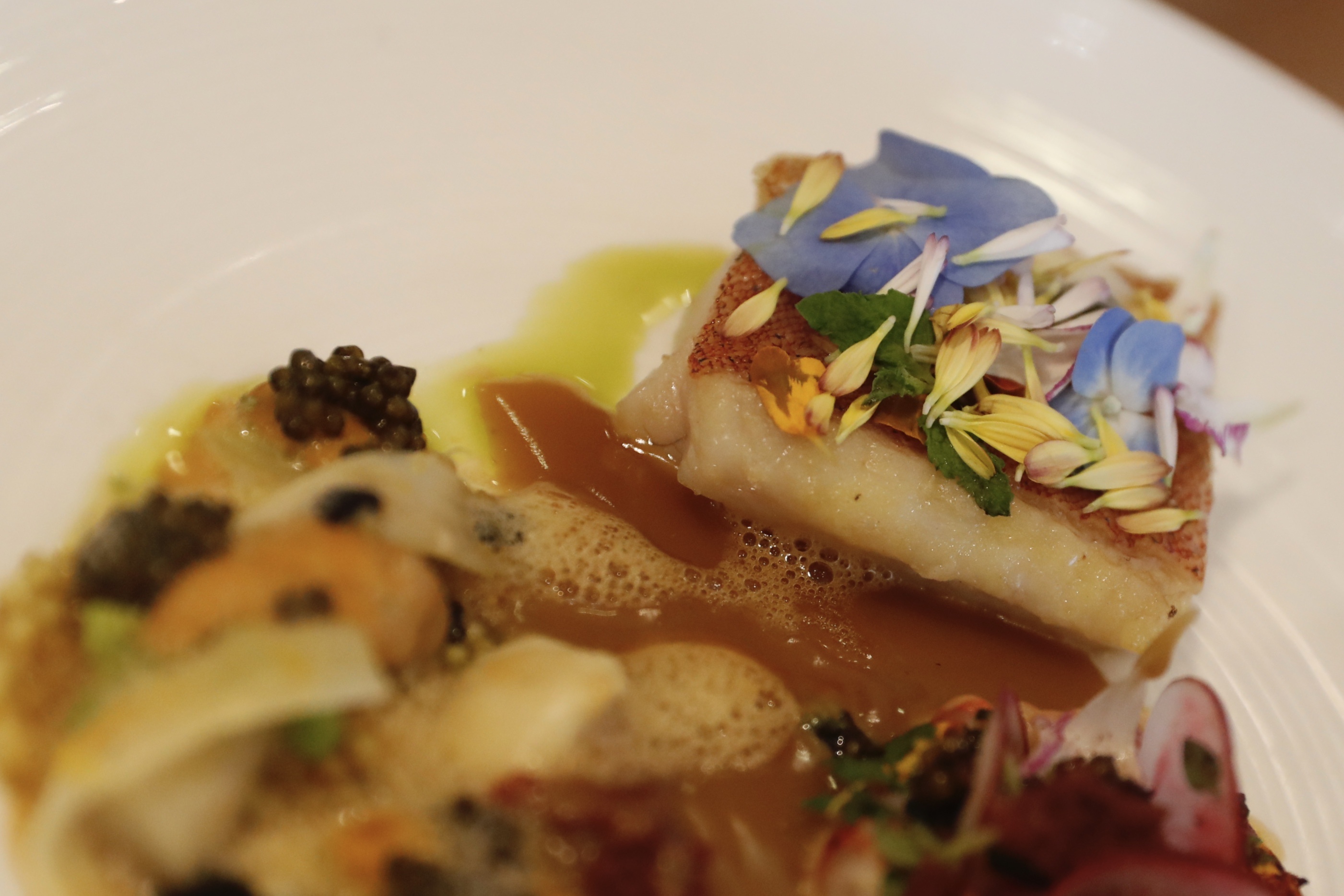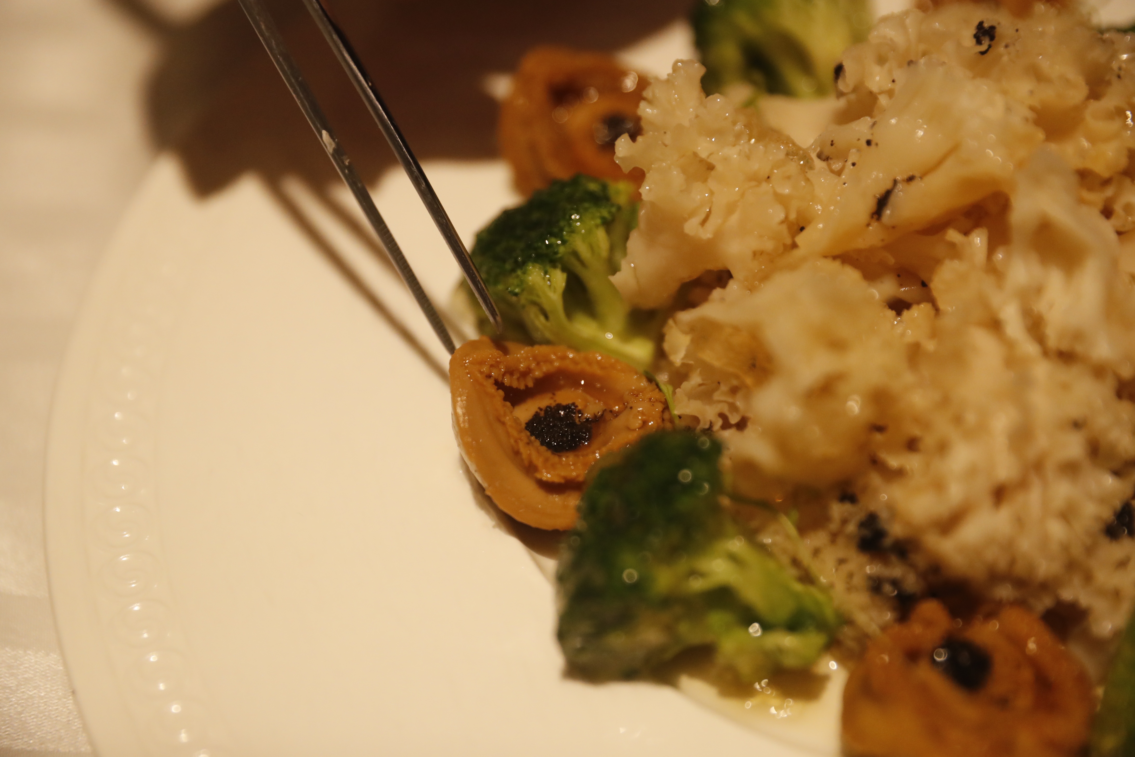 王翔告诉记者,整道菜选用了鲍鱼、黑松露、西兰花、绣球菌的组合。看似简单的食材,却运用了西式的低温烹饪手法,耗时近12小时而成。在低温烹饪下,鲍鱼裙边收缩后微微上翘,达到完整且美观的效果。