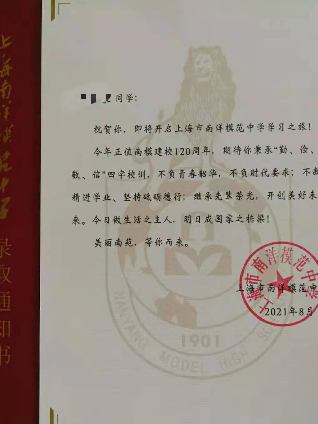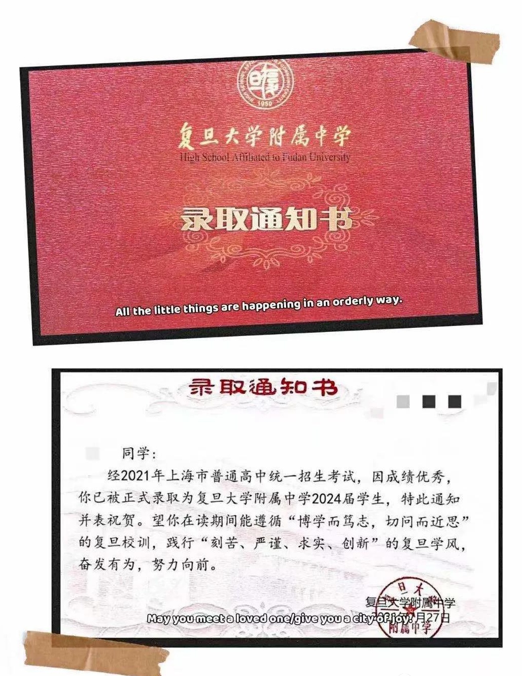 复旦附中的录取通知书上,印上了复旦校训和复旦学风,勉励新生入校后努力奋进。