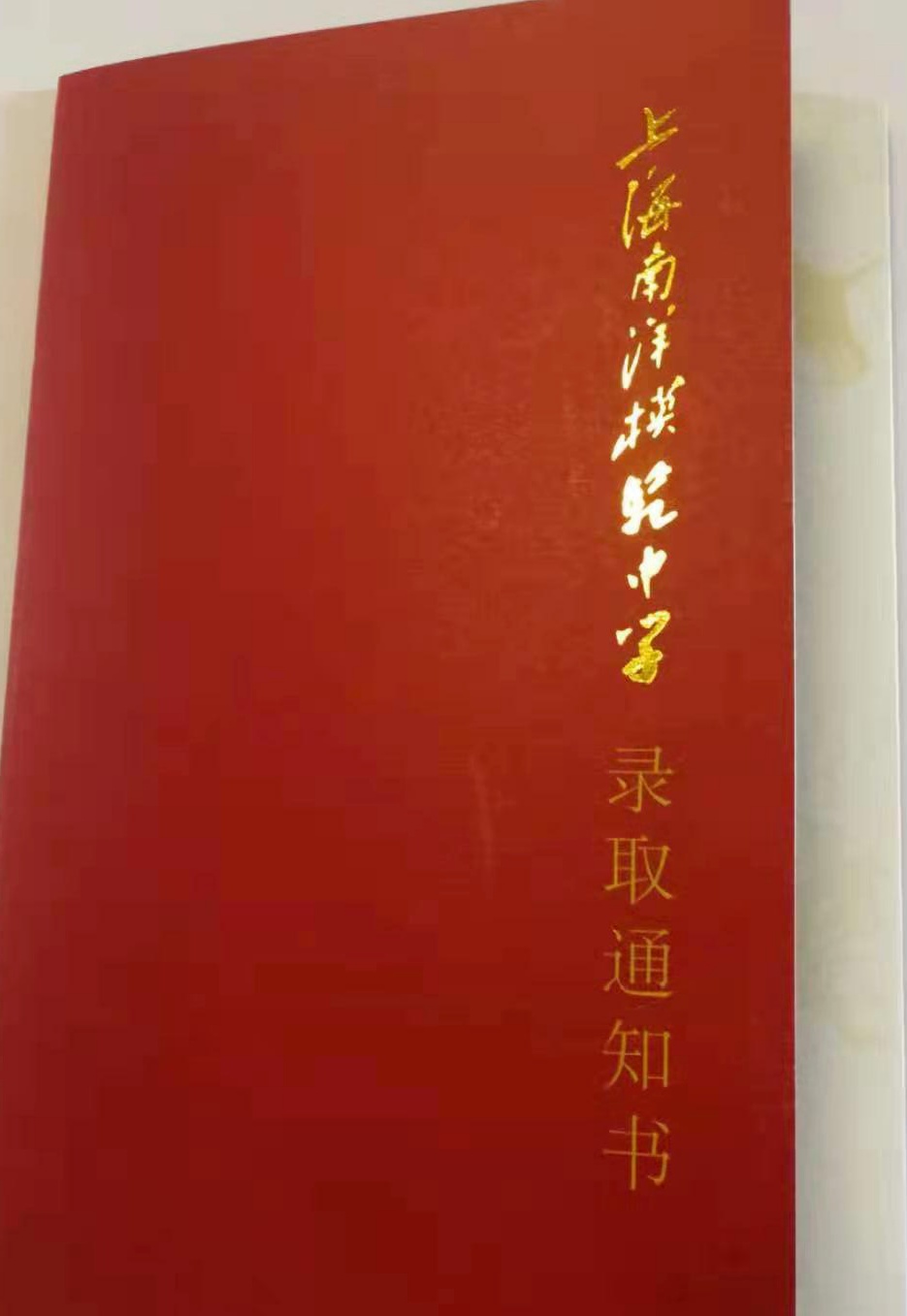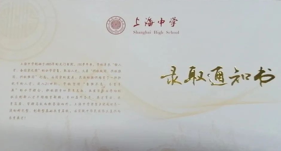 上海中学的录取通知书设计质朴,但“录取通知书”几个字闪闪发光,寓意“金榜题名”。