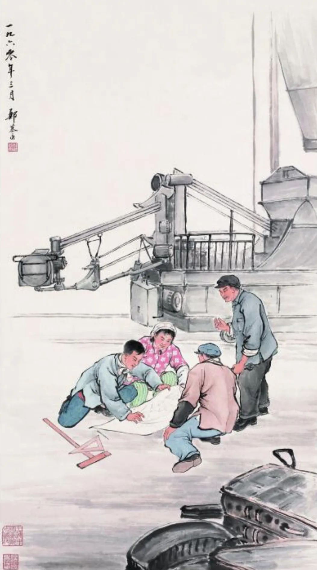《技术革新》不同于他常表现的仕女的婉约,是他深入生活,表现当时如火如荼的社会主义建设之作。作品发挥了他的造型基础和勾描能力,线条精细、勾染结合,画面层次丰富、变化自如,画面中心人物为工人阶级,他们衣着朴素,老技术工人和年轻工人正一同聚精会神地钻研图纸,为实现技术革新、生产力提高而努力。