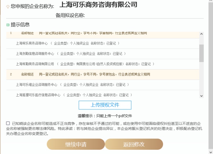 7、完成自主申报名称后,系统将对名称进行自动判别,需要补充授权文件的,按照系统提示上传名称使用的授权文件。