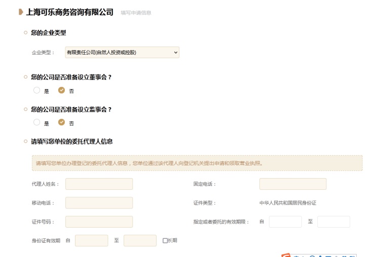9、企业基本信息填报:按照系统提示,逐项填报企业类型、组织机构、经办人信息、营业场所、经营范围、注册资本、投资人等相关信息