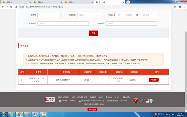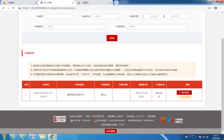 10、查询申请案:查询申请案时,需先选择任一业务项目(如食品经营许可、酒类商品零售许可等),进入后点击页面下方的“办件查询”