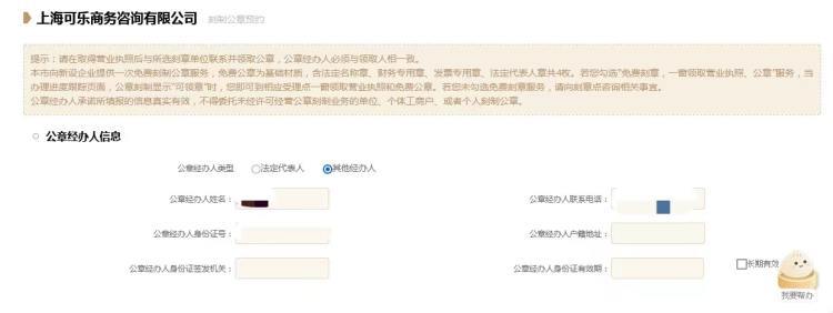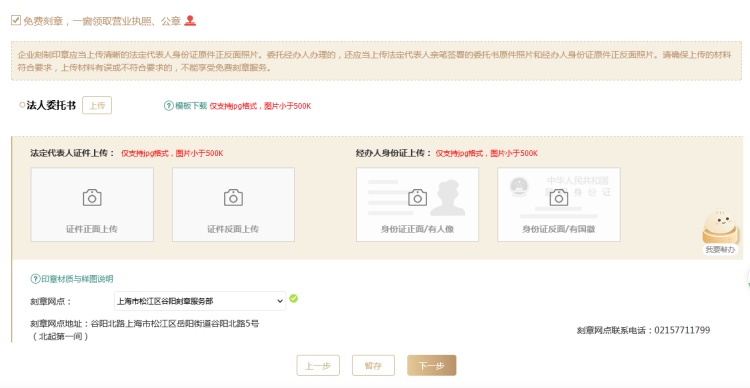 11、完成刻制公章所需信息填报,上传法定代表人与公章经办人正反面复印件照片,选择公章刻制网点