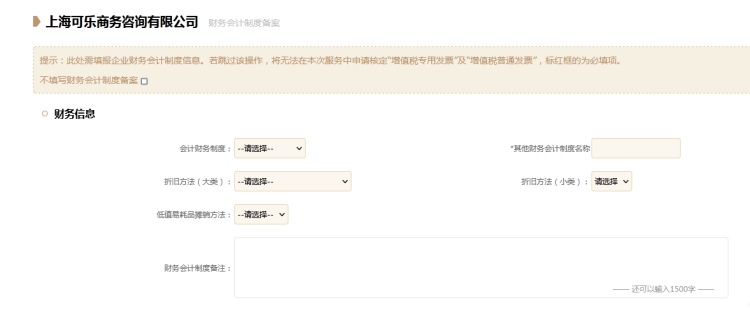 13、按需选择是否填写财务会计制度备案,如无需填写勾选“不填写财务会计制度备案”,如需填写按系统要求完整填报财务信息及核算信息