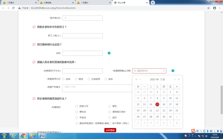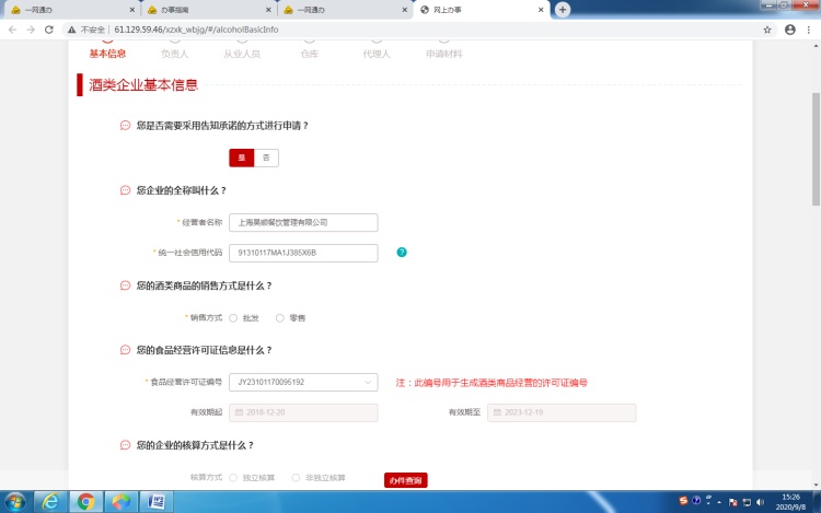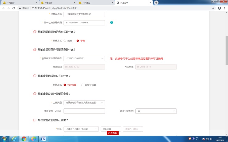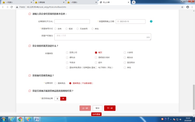 *经营项目栏选择时需注意:一般应选择“酒类商品(不含散装酒)”,如果食品经营许可证的许可项目中含有“散装食品”或“自制饮品制售”方可选择“酒类商品”