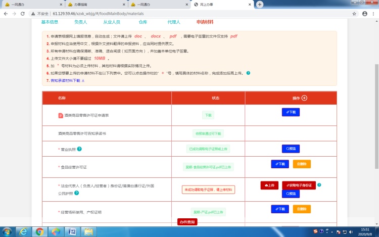 6.2.5申请材料页面:《酒类商品零售许可证申请书》无需下载(生成内容有误);营业执照、法定代表人身份证如能电子调用无需上传,其他材料需上传