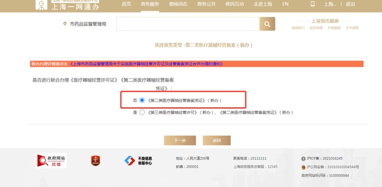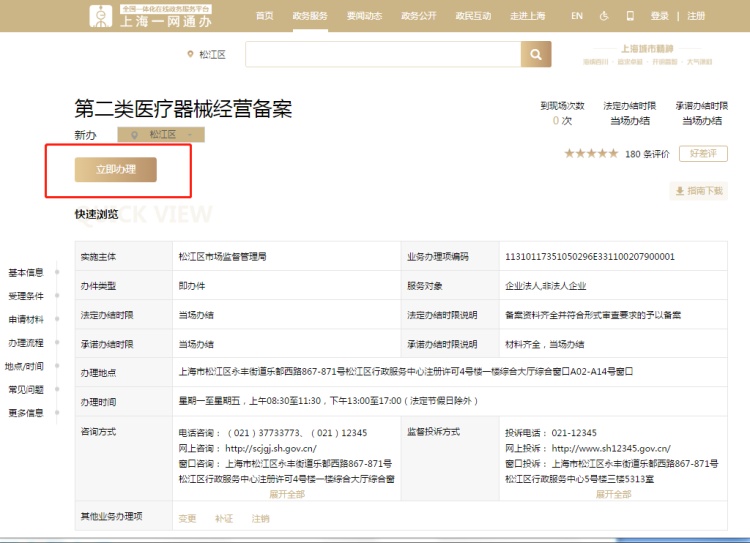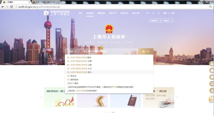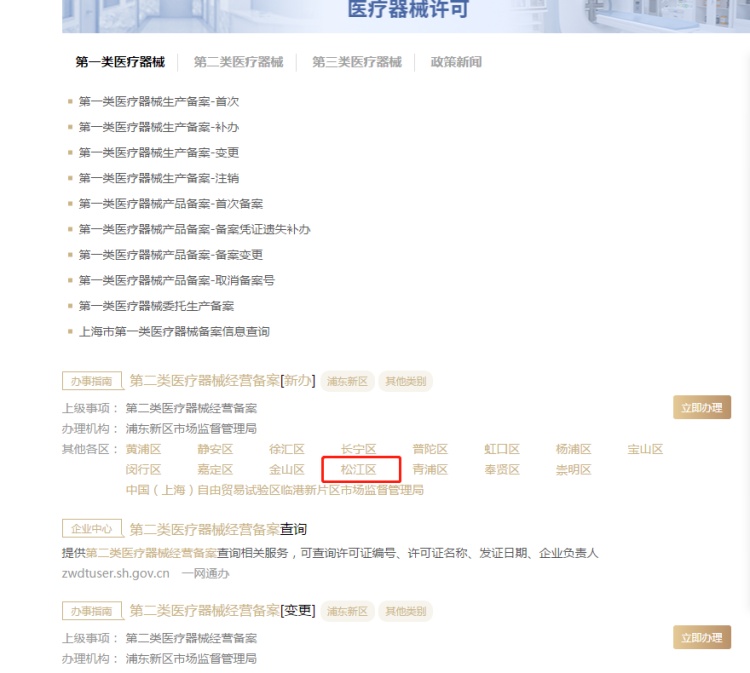 1、登录“一网通办”网址:http://zwdt.sh.gov.cn/,首页搜索:第二类医疗器械经营备案;进入页面后,点击“第二类医疗器械经营备案(新办)中“松江区”