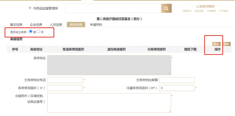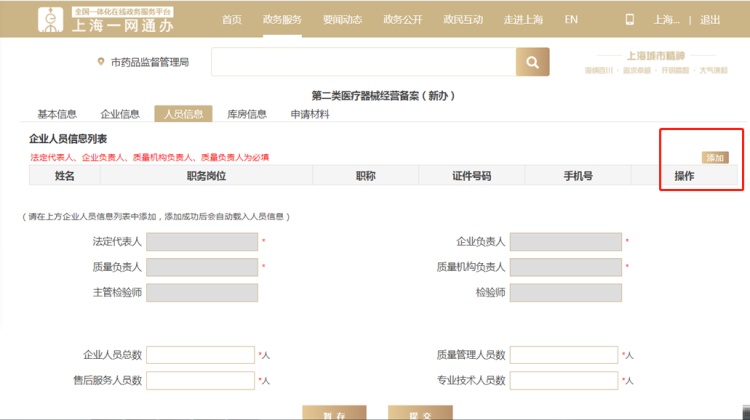 3.2根据提示填写,其中“人员信息”及“库房信息”需点击“添加”按钮填写。