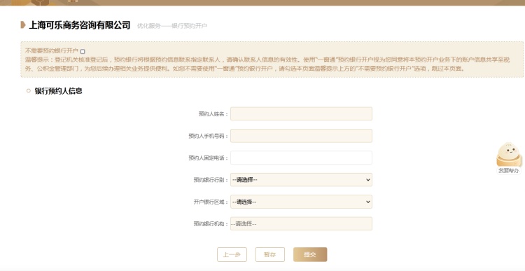 16、按需选择是否预约银行开户,如无需开户勾选“不需要预约银行开户”,如需开户服务按系统要求完整填报银行预约人信息