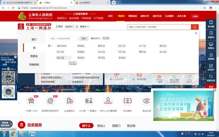 3、选择部门、区、管委会 — 区 — 松江区 — 前往