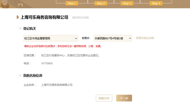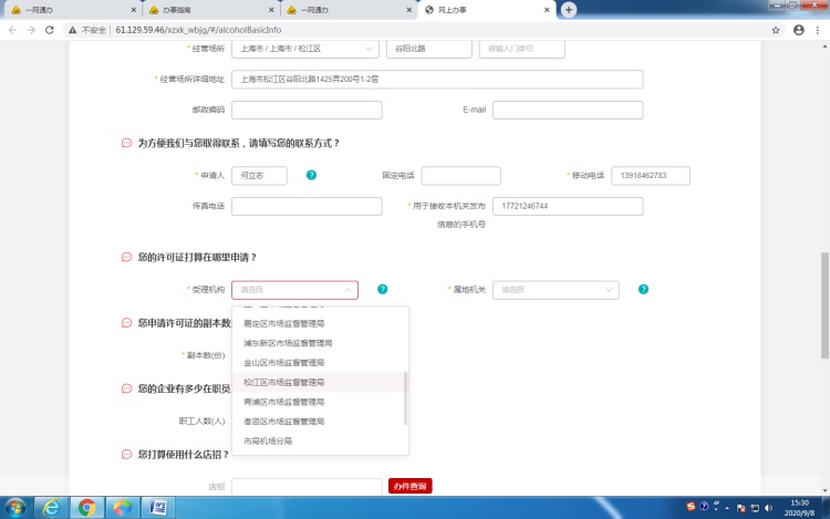 *受理机构选择“松江区市场监督管理局“,属地机构按实际选择属地市场所
