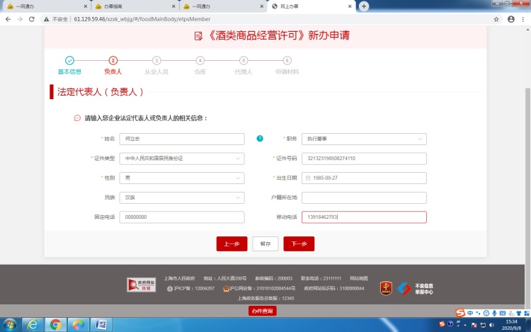 6.2点击“下一步”,进入法定代表人/负责人页面