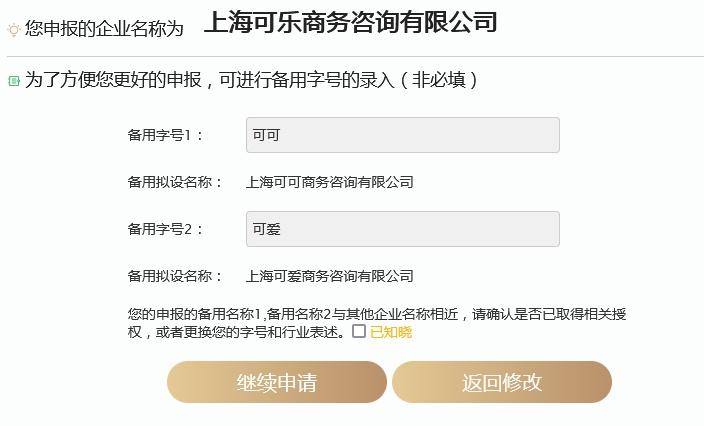 6、自主申报名称填写完成后,还可以选择申报2个备选名称