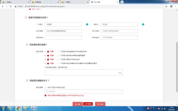 6.2.4代理人页面:其中“委托人”为法定代表人或负责人