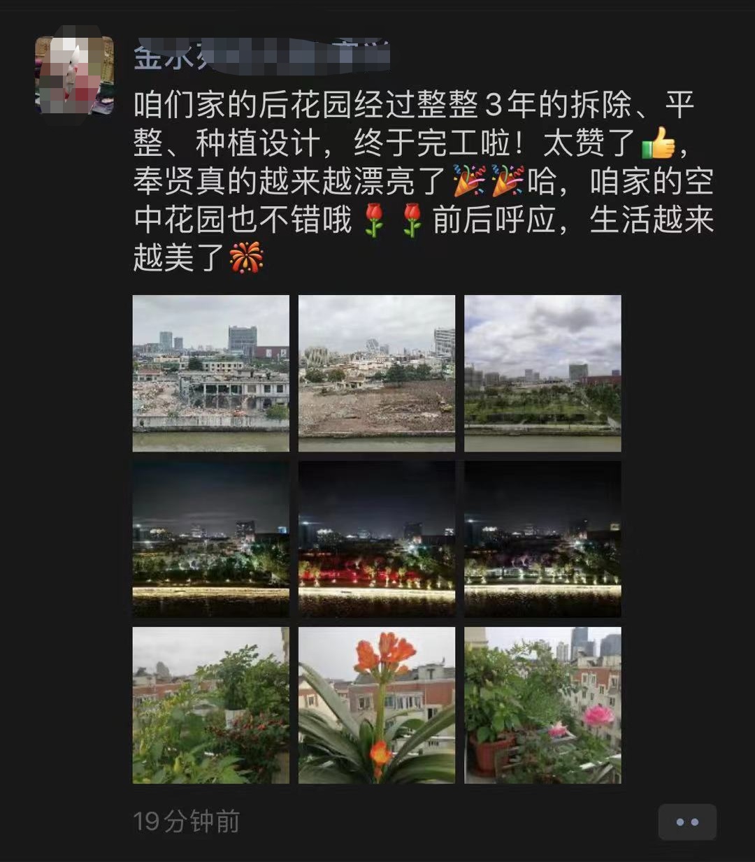 近日,在朋友圈里看到市民这样一段话:“咱们家的后花园经过整整三年的拆除,平整,种植设计,终于完成了,太赞了,奉贤真的越来越漂亮了,咱家的空中花园也不错,前呼后应,生活越来越美了。”