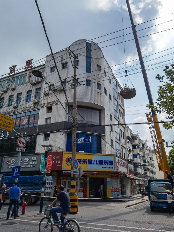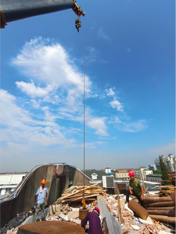 商厦位于镇区主干道旁边,周边人流量大,环境极其复杂,楼顶搭建棚屋“犬牙交错”分布,现场还涉及整栋楼的通风排气、用水用电、燃气安全等方面,高空整治作业难度系数大,给拆违行动带来一定难度。且由于位置特殊,人员上下基本靠电梯,楼梯通道较为狭窄,可供搬运和作业的空间十分有限,所以如何将拆除后的建筑垃圾清运下楼成为了一个难点。