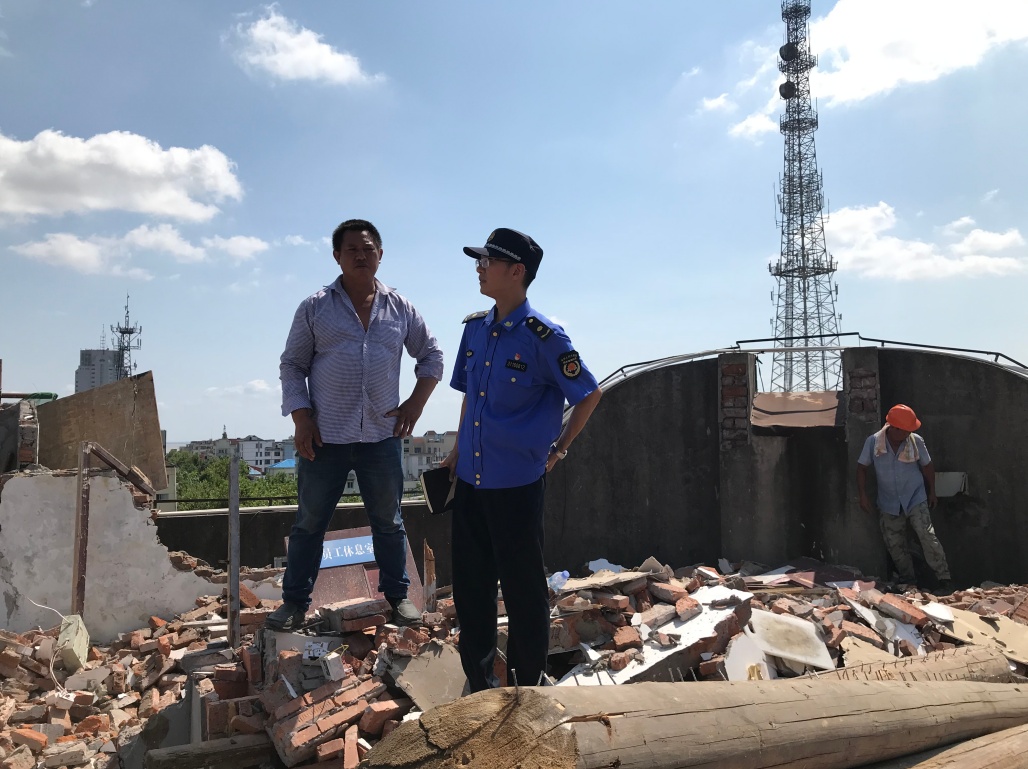近日,崇明区城桥城管中队联合公安、消防、保洁等部门对八一路一所商厦楼顶约300平方米,10余间违法建(构)筑物进行了集中拆除整治。
