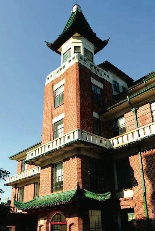 耶松船厂西面的中部作塔楼造型,顶部塔亭四角设计为绿色琉璃瓦翘檐。窗上部有扁圆券,窗楣上有弧券装饰。