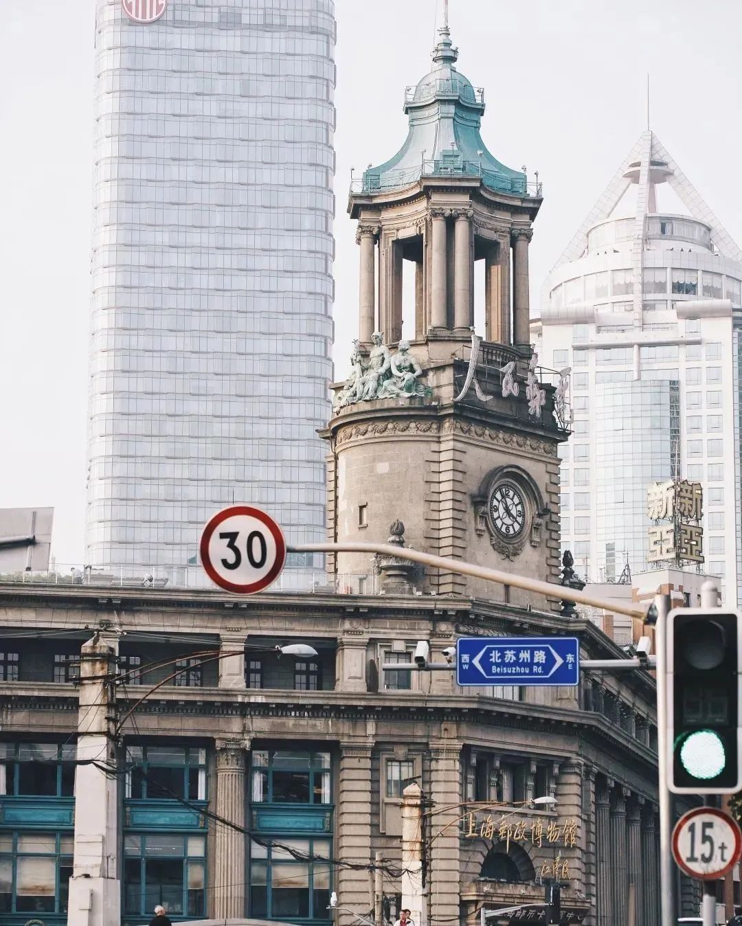 上海邮政总局大楼位于北苏州路276号,为欧洲折衷主义建筑形式的代表作。钢筋混凝土框架结构,地下一层,地上四层,有通贯三层的简化科林斯巨柱式列柱。转角处顶部为钟塔,为17世纪流行的意大利风格的巴洛克式穹顶,钟楼两侧各有一组三人组成的群雕。作为中国近代邮政发祥地,上海邮政总局历经海关邮政、中华邮政的百年沧桑,如今这些故事都被收藏在中国邮政博物馆内。