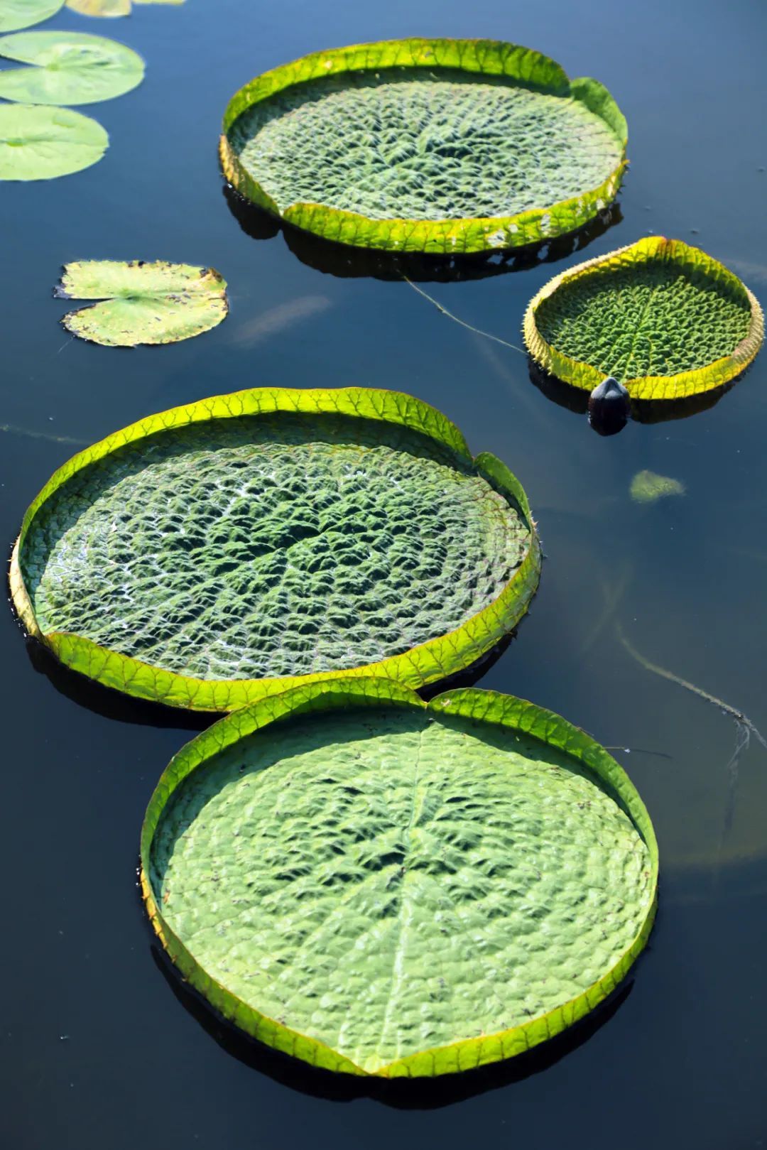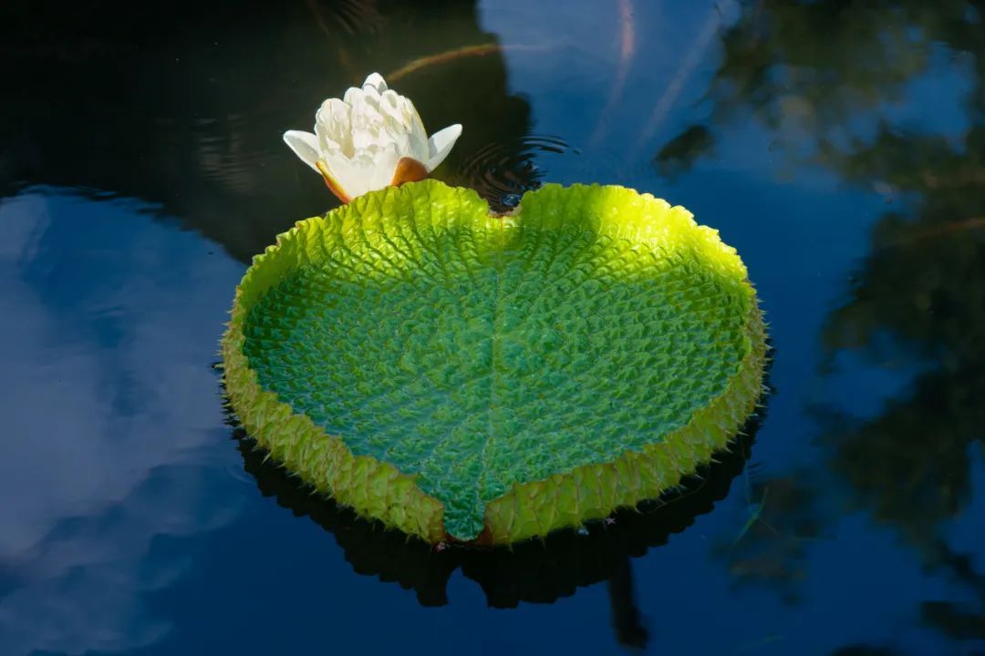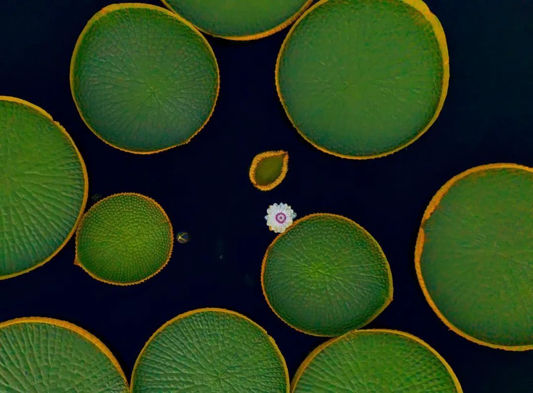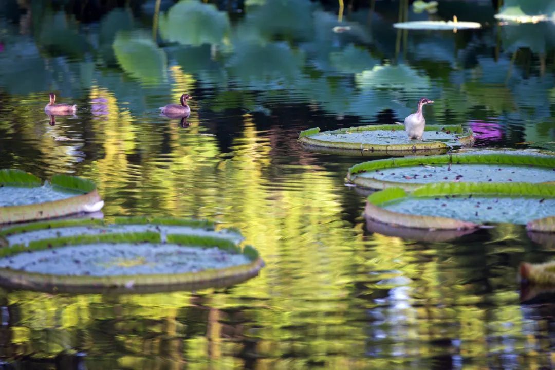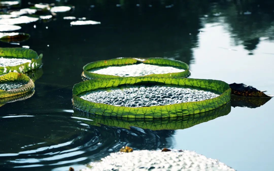 王莲是睡莲科王莲属植物统称,它们的叶片奇特,仿佛一个个玉盘浮于水面,整个场面十分壮观。