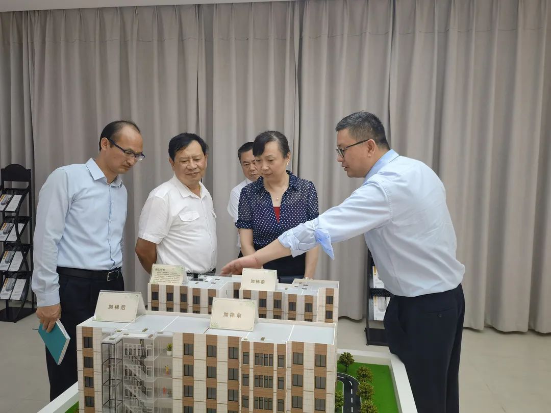 在加装电梯服务中心,调研组参观了不同房型加装电梯的前后对比模型,听取中心推进加装电梯工作情况介绍。