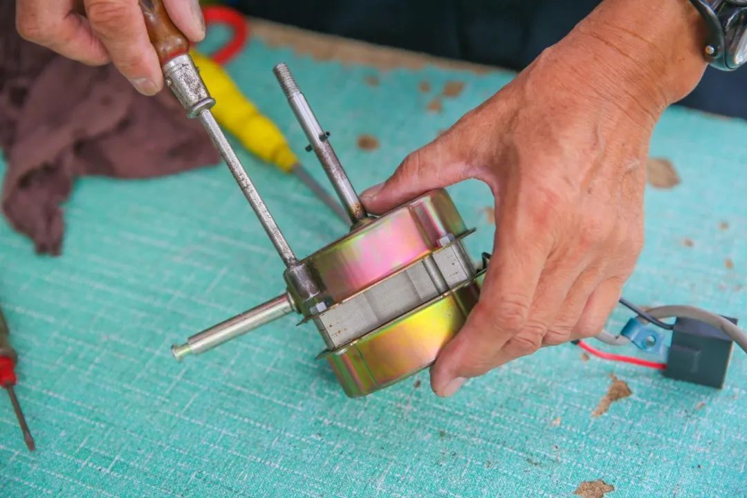 他说:“有一次单位派我去市区采购,路过橱窗看到里面有台落地电风扇,觉得特别精致。那时候其他地方还没有呢,我盯着看了好久,打算回家就做一台。”电扇马达里的定子,外面买不到,他只能自己做。一圈一圈绕铜丝、一层一层包绝缘体,用蜡线缠住,固定住铜丝。“一共要绕主副两套线圈,因为启动的时候需要不同的磁场产生扭力,然后带动转子。”