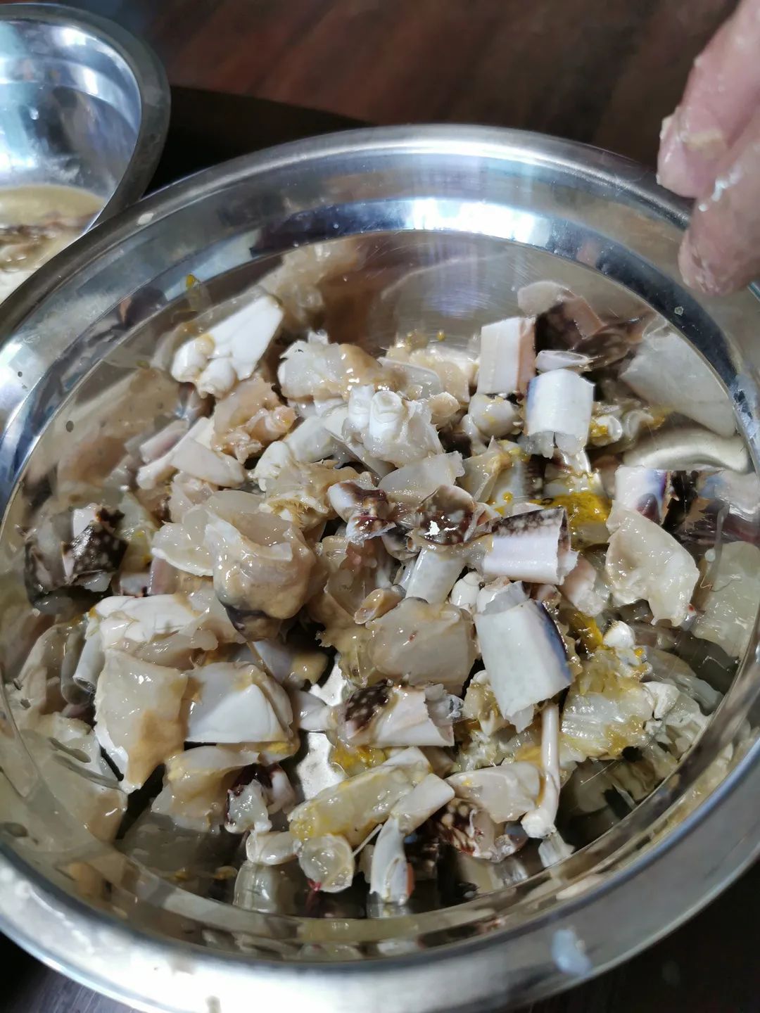 1.梭子蟹清洗去腮后,用剪刀剪成小段。