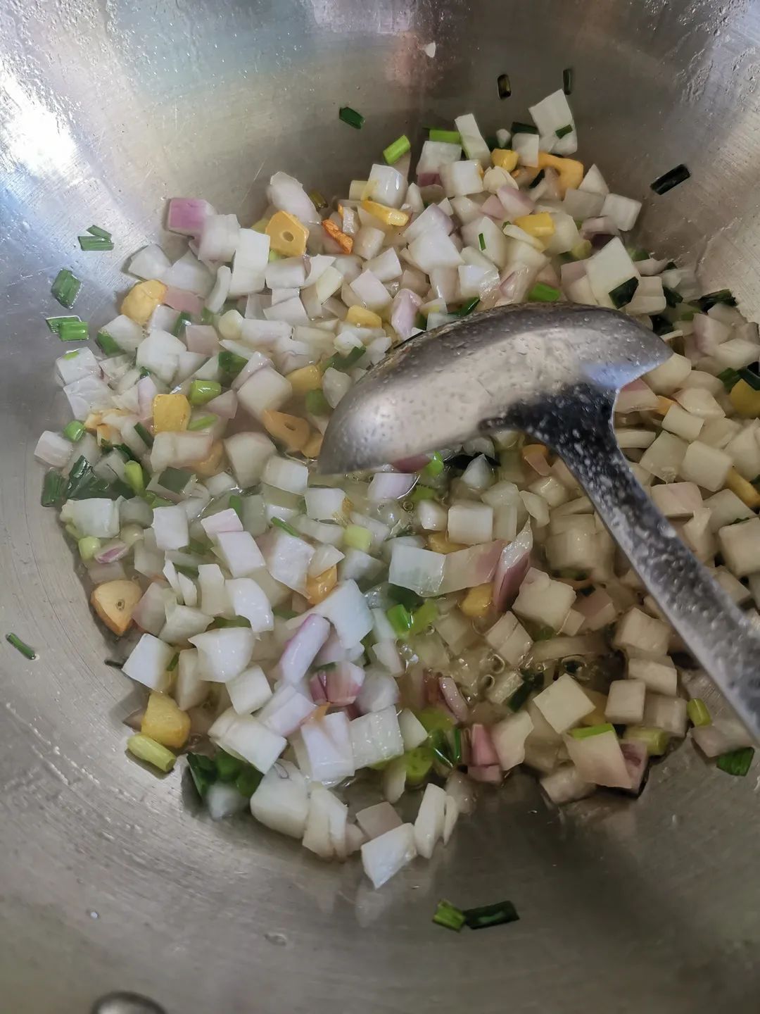 1.葱姜蒜底料炒至略微泛黄即可。