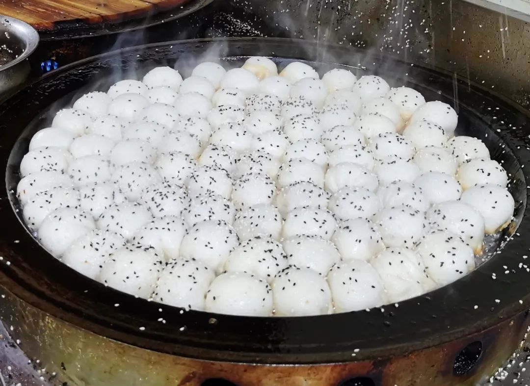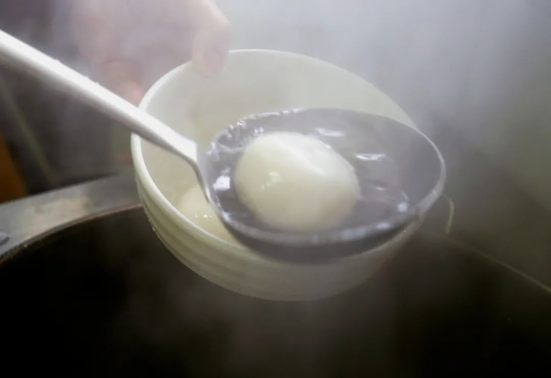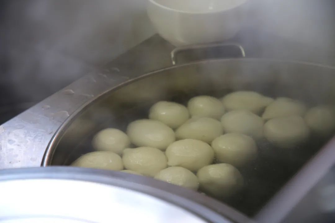 一口大锅中,又白又胖的汤圆正在沸水中“扑通扑通”地翻滚着。这里的汤圆口味繁多,有香甜的芝麻馅、浓鲜的肉馅、柔滑的花生馅……