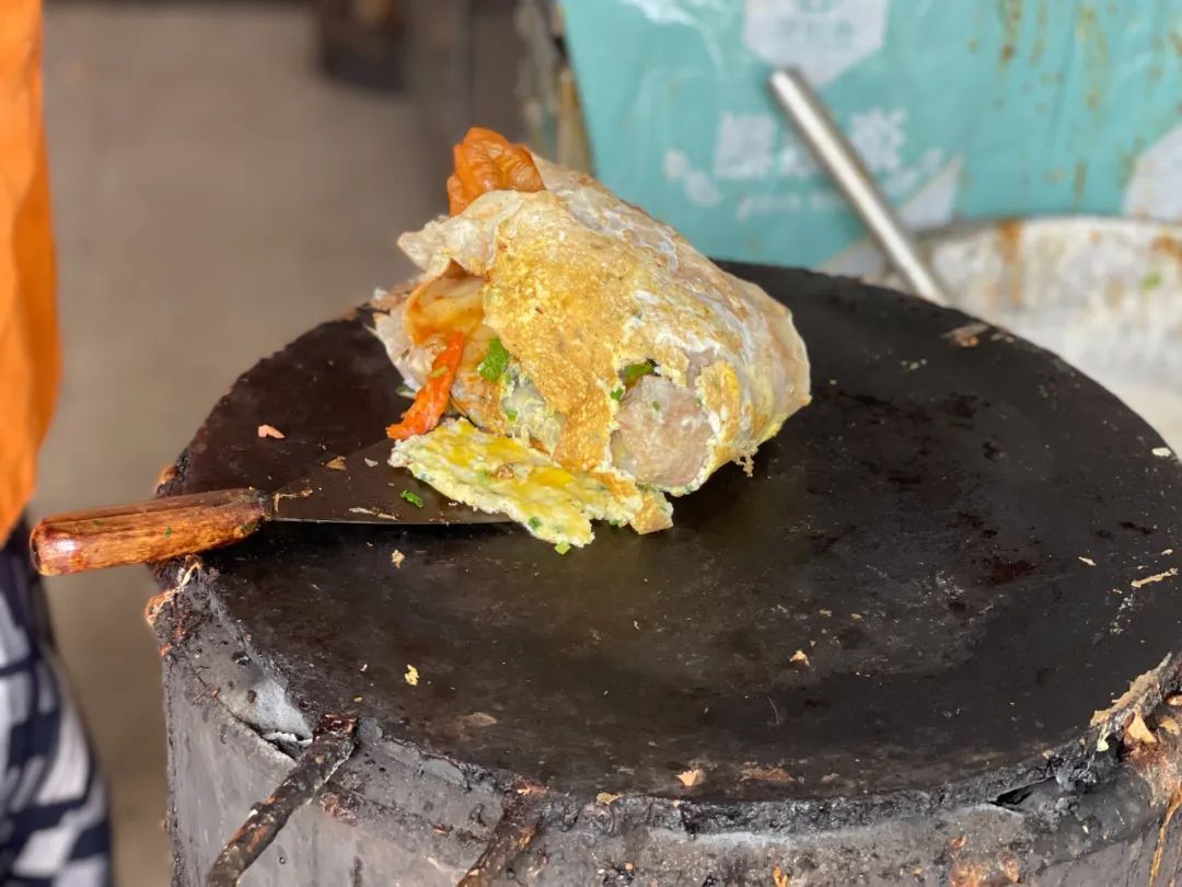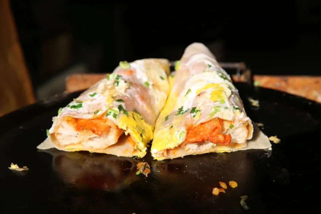 小小一张面饼铺开,打蛋,刷酱料,包裹进油条或脆饼,再加上一串里脊肉,最后撒上的点点葱花,色泽诱人、香味扑鼻。一口咬下去,咸鲜适中、脆软交替、口感丰富。