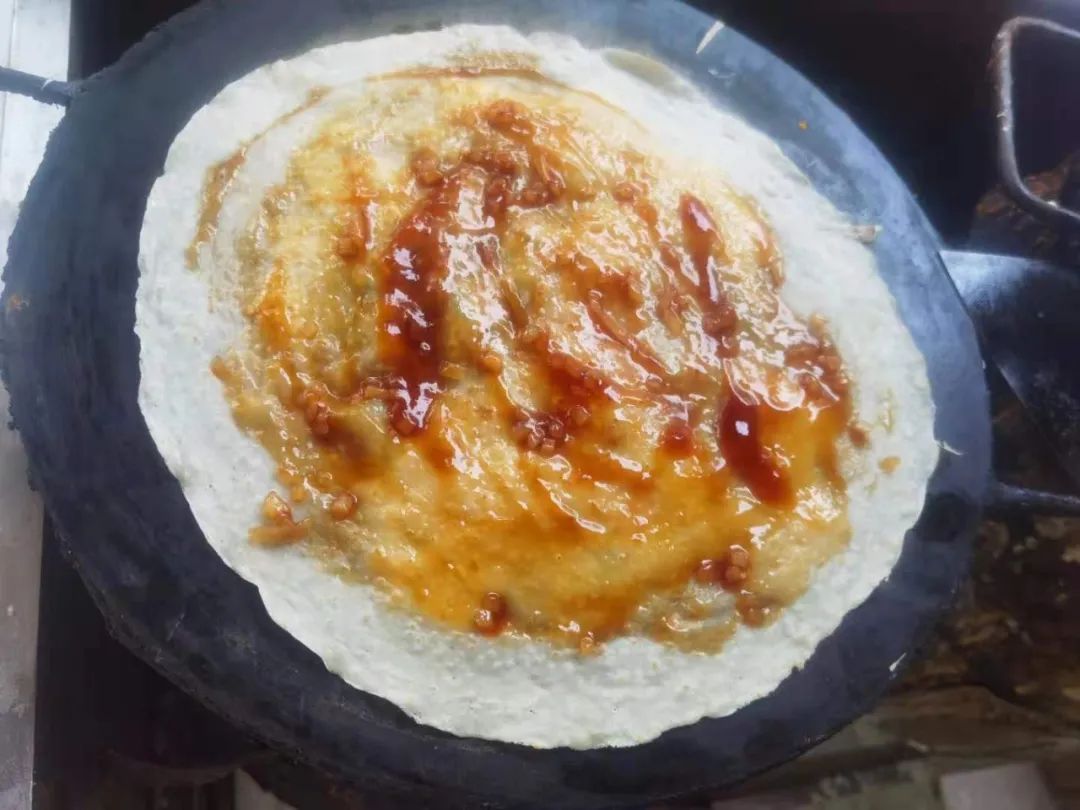 噗呲!老板娴熟地单手打下一个鸡蛋,铺平、撒料,不断搅拌抹匀,最后再涂上一层厚厚的甜面酱,齐活。不少“懂经”的吃客还会在隔壁早餐店买上一根油条让老板加到饼里,爆赞。