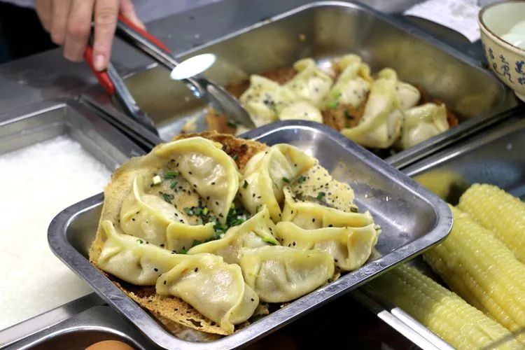 他们家有鲜肉、京葱牛肉、荠菜、玉米、虾、三鲜豆腐六种口味的锅贴,皮薄、馅大、汁多,吃起来满嘴鲜香。