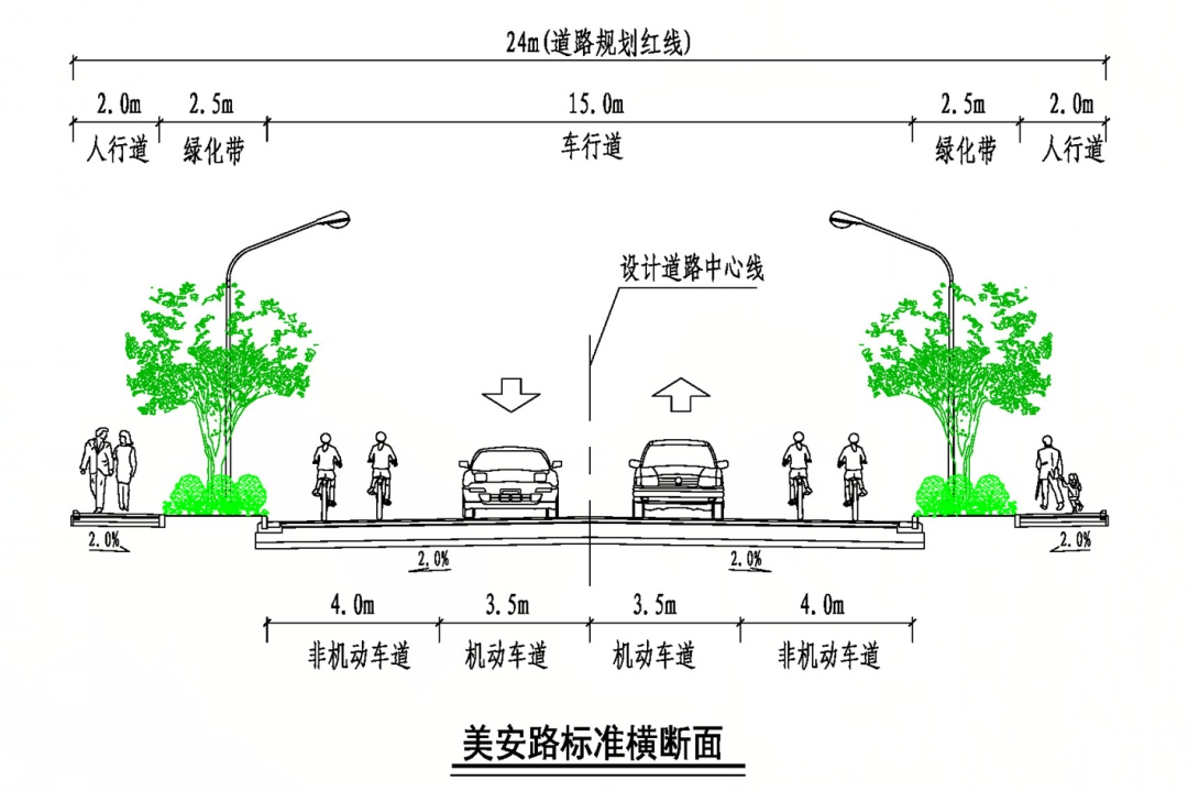 道路工程:机动车道、非机动车道、人行道建设同步实施。