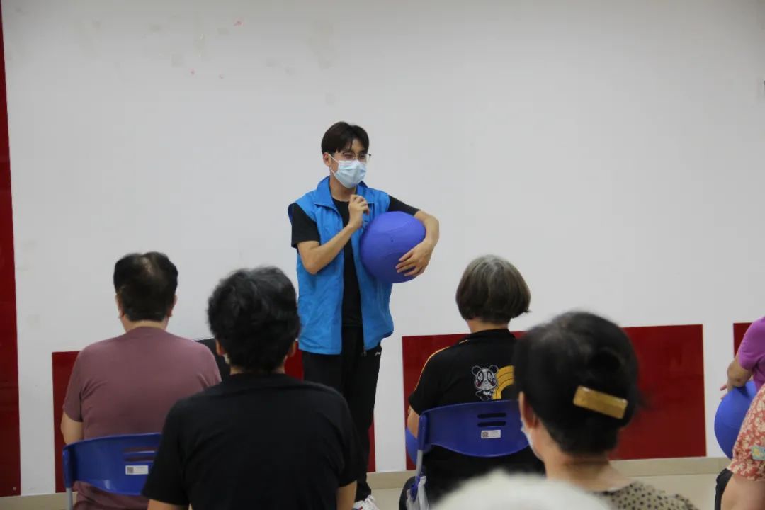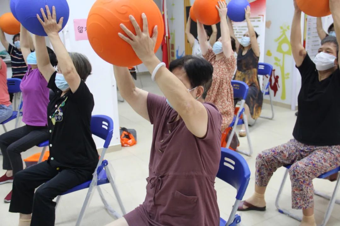 在随后教授要领的过程中,这群年过半百的阿姨们,坐在自己的座位上,跟着老师学习动作,带着无极球“缠绕转”。几套动作下来,大家既舒展了身体,又放松了身心。