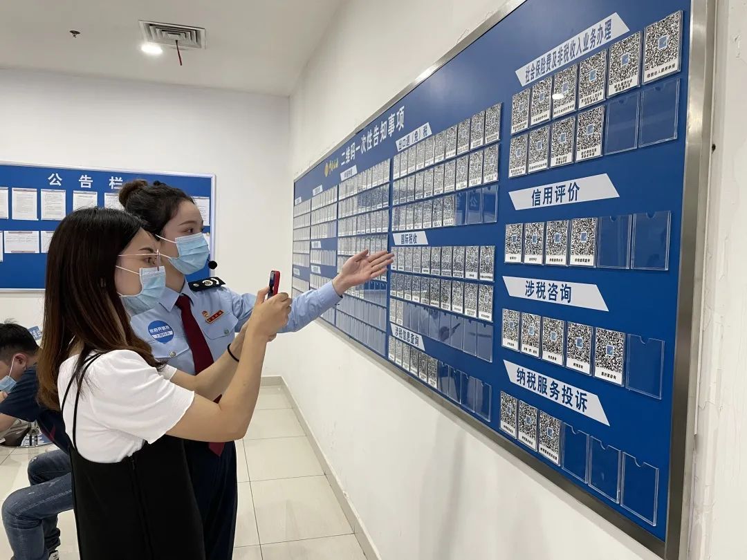 纳税服务厅的政务公开区,除了工作人员的信息展示、税收宣传资料陈列外,还有专门的一面墙用来展示二维码。税务工作人员介绍,这里展示的是各类事项的办税指南。
