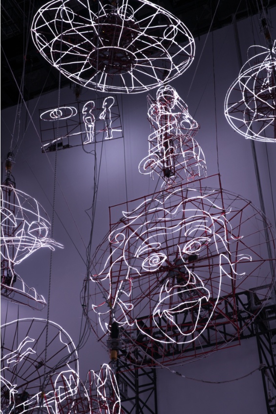 走进展厅便会看见一个超级大的装置,叫做“未知的相遇”,是联通古今中外的“宇宙树”。作品通过手工搭建的墨西哥烟花塔呈现出多维的画面,表达不同文明之间的碰撞。
