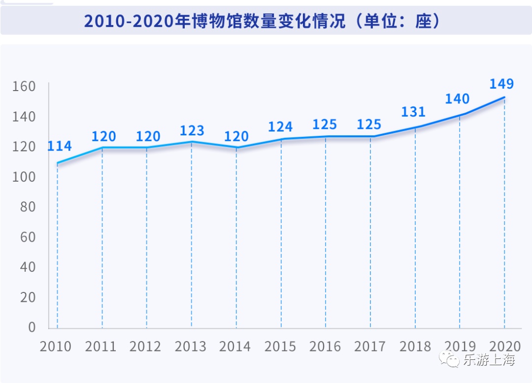 截至2020年底,上海市已备案博物馆149家,文物50家、行业65家、非国有34家。其中,国家一、二、三级博物馆29座,占全市博物馆总数的19% 。2020年新增2座国家一级博物馆,6座国家二级博物馆,1座国家三级博物馆。