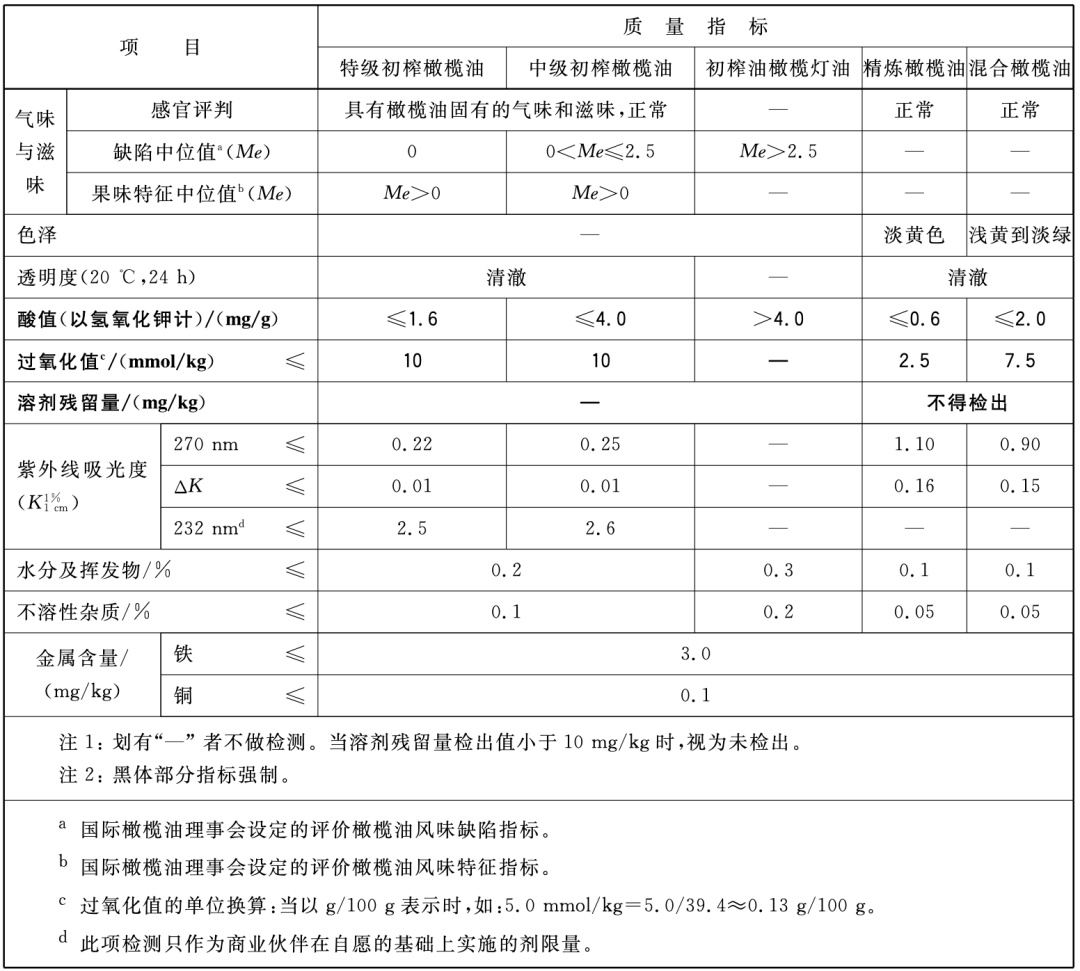 GB/T 23347—2009中不同橄榄油的质量指标