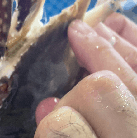 但是,大家要注意哦,只有母蟹的肚脐才会带黑红色,可以根据肚脐的颜色来判断肥瘦。如果大家拿到的是公蟹,无论肥瘦,公蟹的肚脐都是白的。所以,这个办法不适用于公蟹。