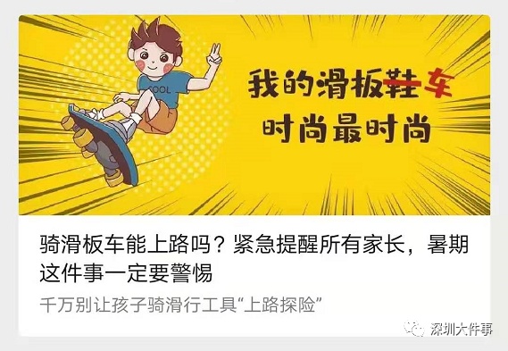 去年8月,深圳一8岁小学生独自骑行电动滑板车出行,过斑马线时与小车发生碰撞后摔倒,致右腿受轻微伤、全身多处挫伤,幸运的是并无生命危险。