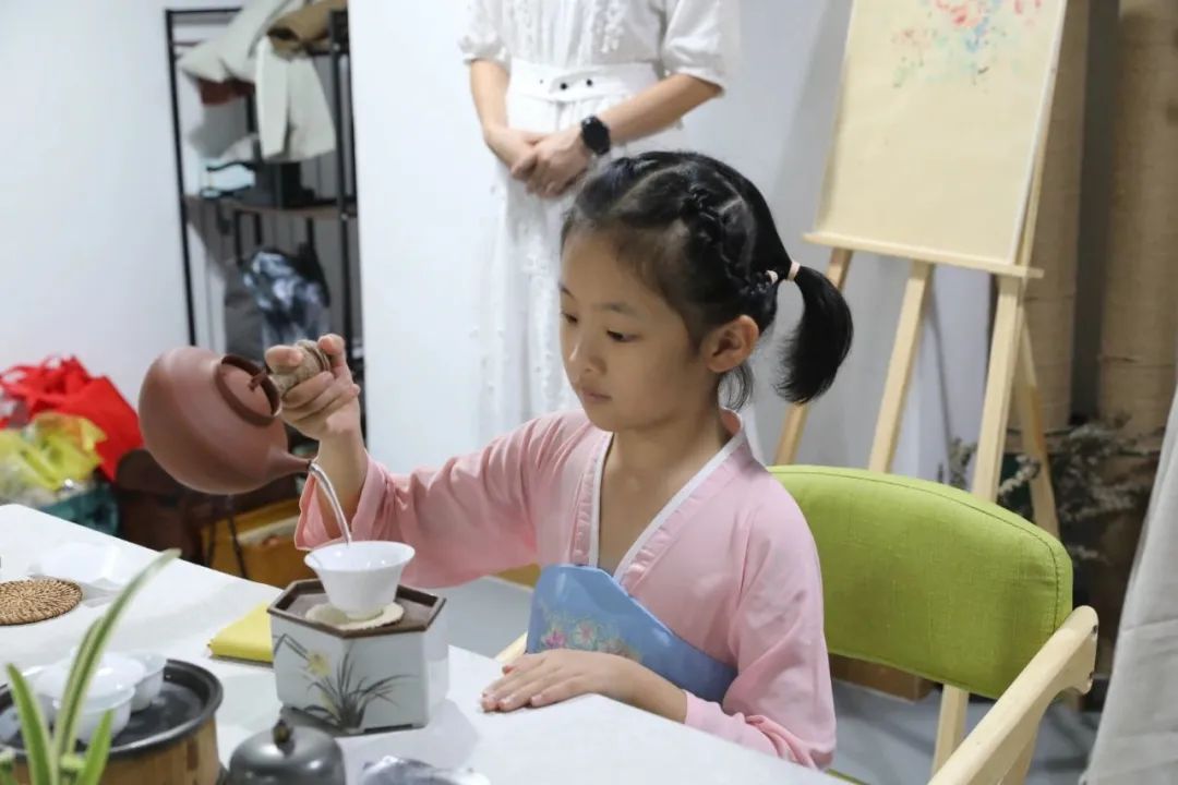 葫芦丝趣味班是嘉绣社区推出的“公益学堂”十门兴趣课程之一。另外一门广受追捧的兴趣课要属少儿茶艺班,任课老师是居民李晓艳。李小艳擅长茶艺,在她的课堂上,孩子们身着古装,从茶礼开始学起,站立、作揖,再有模有样地按步骤泡茶。
