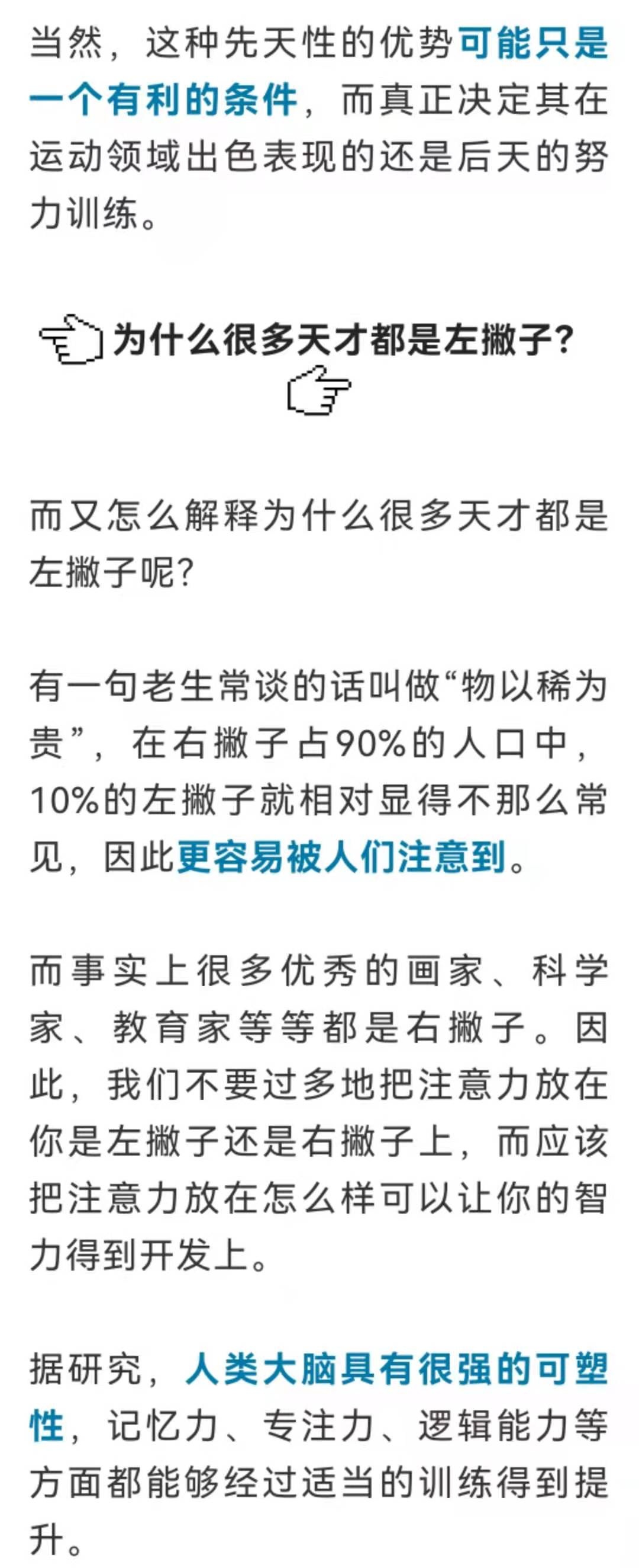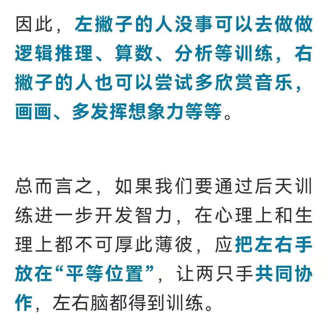 但其实我们也知道,虽然左右脑各司其职,但其实是协同运作的,大脑控制活动通过左右脑配合完成,先天的这种优势差别并不大。