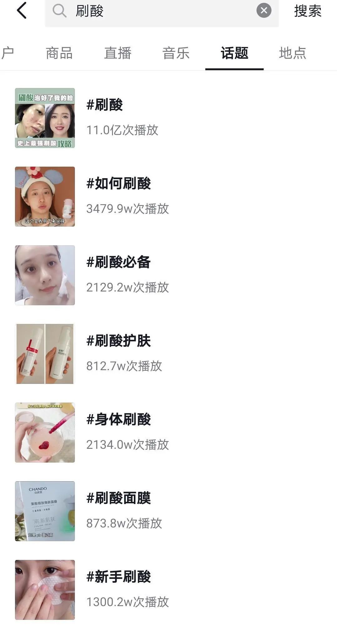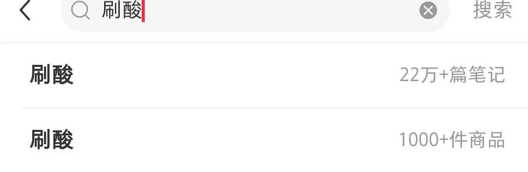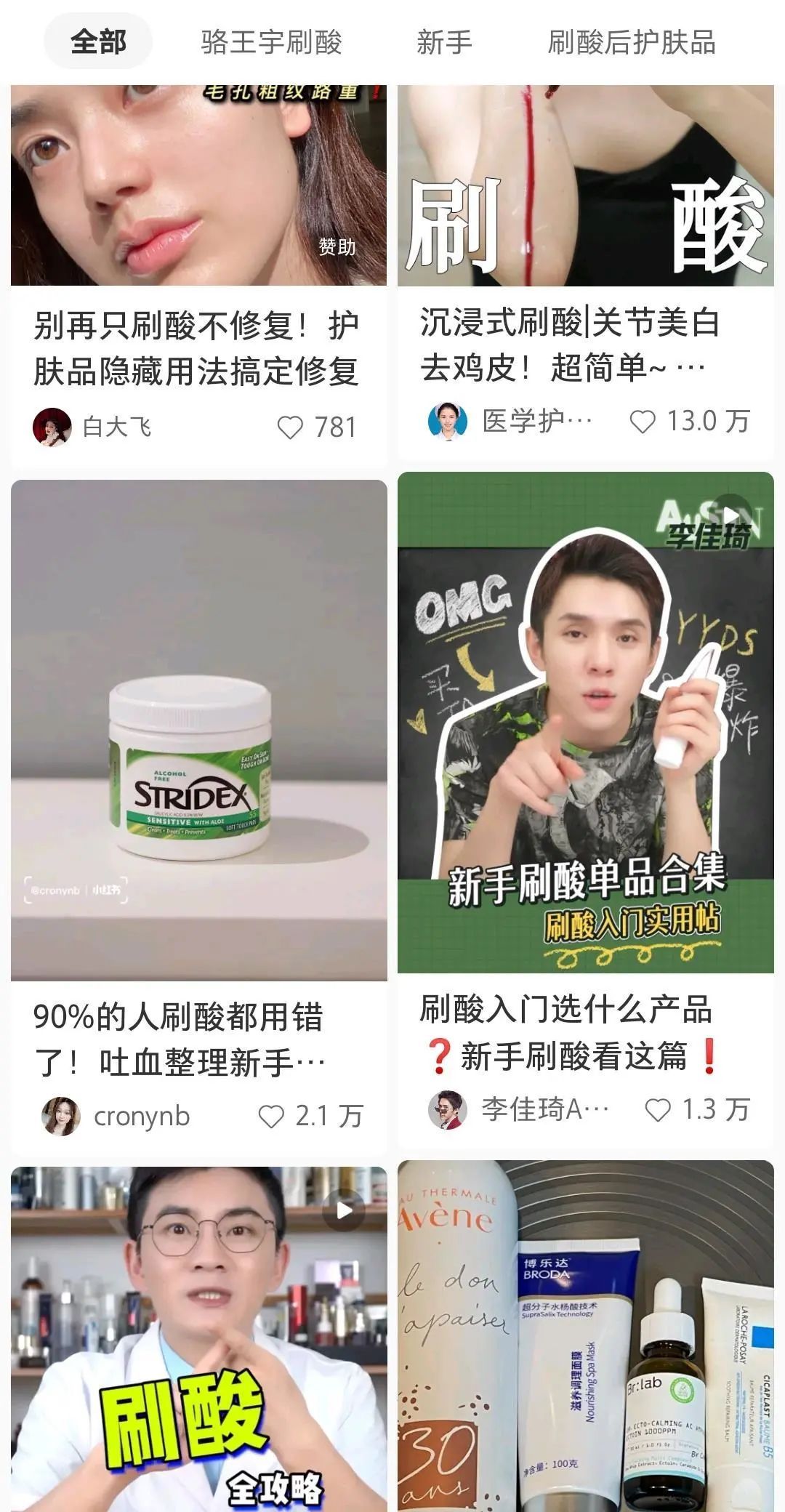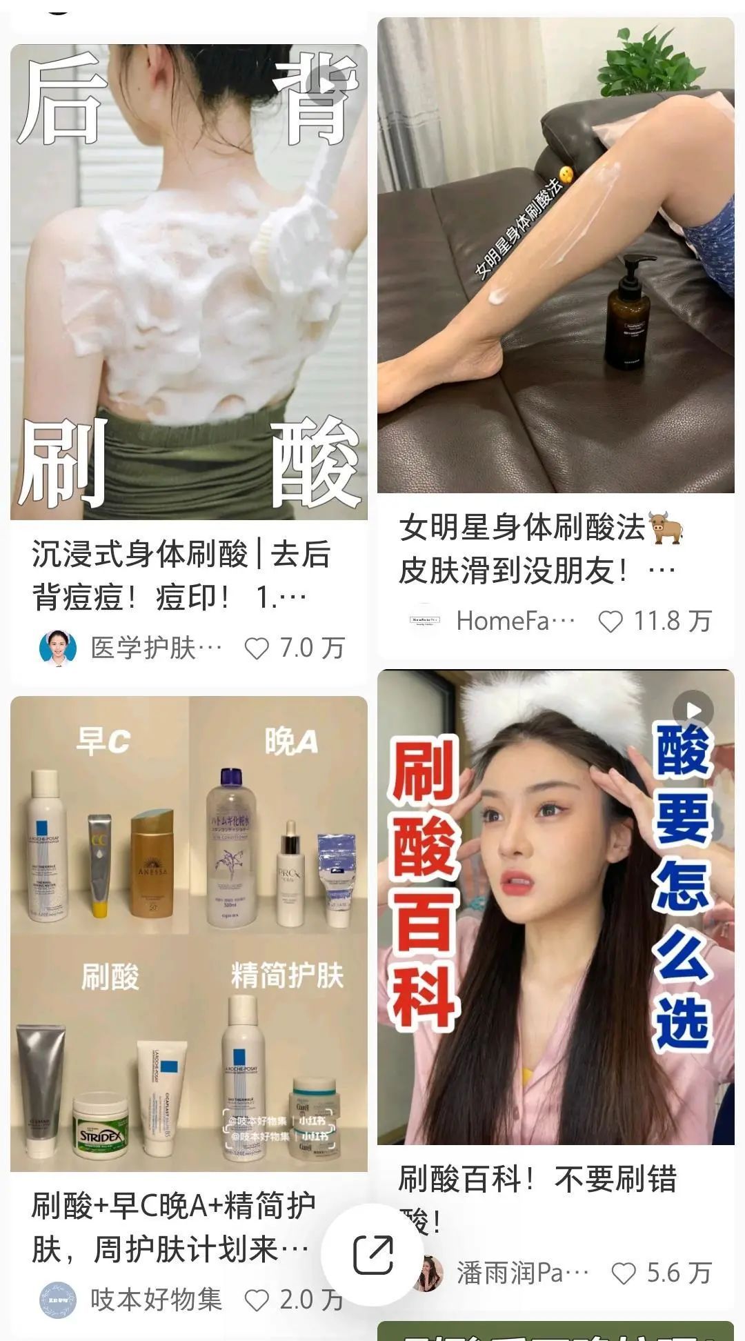 小红书APP上搜索“刷酸”,出现大量在家刷酸的笔记攻略。
