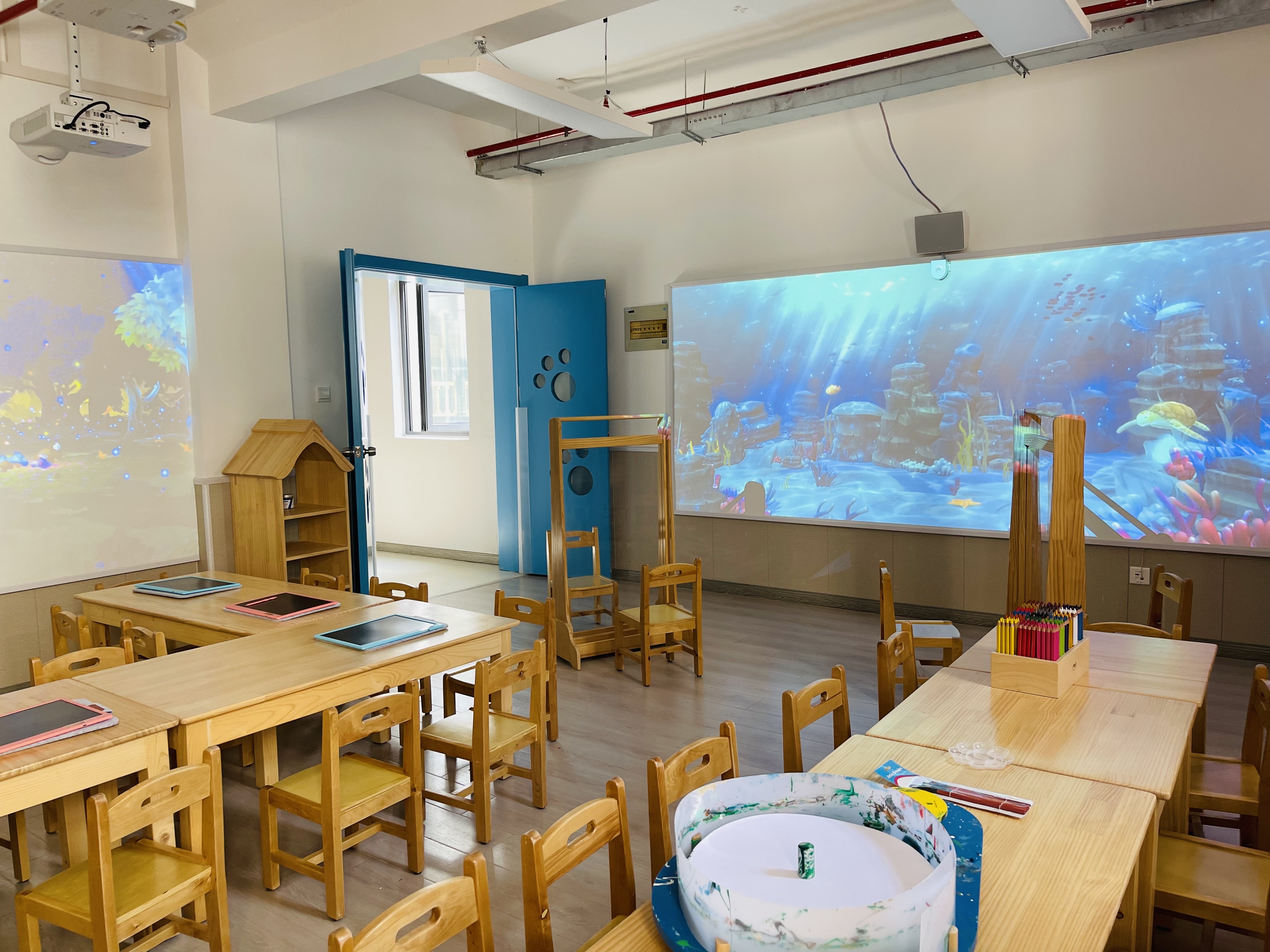 以“幼有善育”为目标,南京东路幼儿园将具有鲜明特色的生活课程充分融入新校舍的环境创设。改建后的南京东路幼儿园北京东路分园,共设6个班,其中小班和大班各3个,幼儿人数约180名。分园全新创设了多功能活动室,如生活特色体验室,以明快的色彩打造温馨的居家感,提供幼儿日常可见的各类生活小工具,在探索和尝试中体验真实生活;阅读交互体验室,通过投放点读笔、智能平板和互动故事机,与沉浸式的图书阅读区域相融合,打造幼儿多元阅读体验感;美工涂鸦体验室,以多媒体为亮点的多功能互动墙,能把幼儿的平面作品变为立体可动的影像即时投映到墙上。