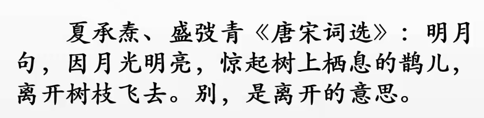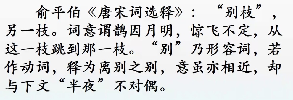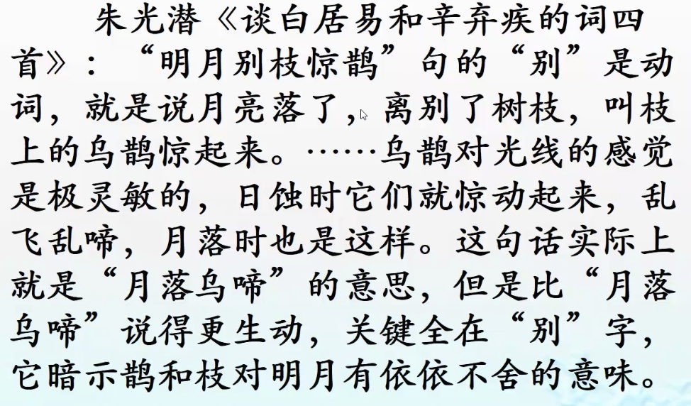 辛弃疾的这首《西江月》是千古名篇,其中“明月别枝惊鹊”中的“别”字可以理解为是动词“离别”,也可以理解为是“另外的、其他的”之意。如何解释这个“别”字,会对理解这首词的意境造成很大的区别。杨老师列举了多位研究者对于“别”字的理解,反复推敲,精心解读,最后得出的结论有理有据,令人信服。