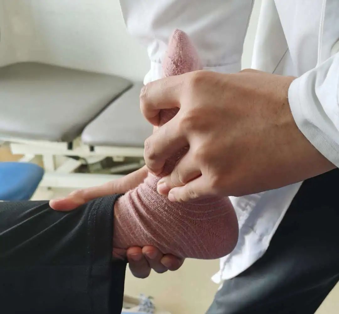 然后使用肌内效贴对王女士的脚踝进行消肿和固定处理。