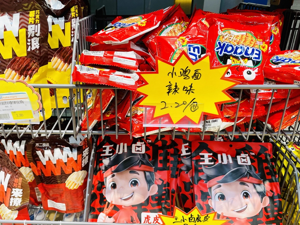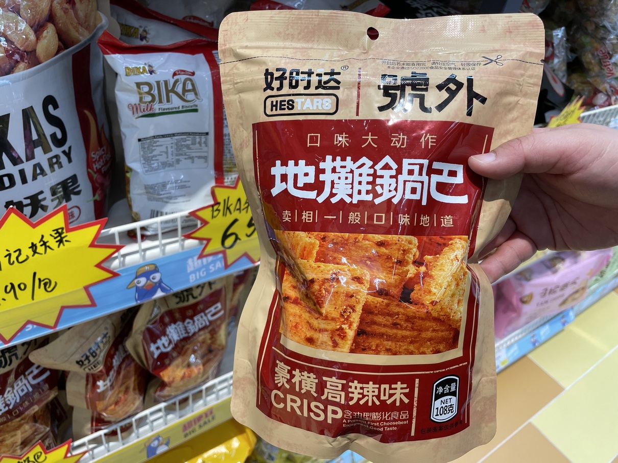 像卡乐比薯片、进口巧克力、地摊锅巴、榴莲冻干......网红小零食被放在最醒目的位置,店员说,都是爆款,打折通常也比较给力,让人分分钟都想塞进购物框。